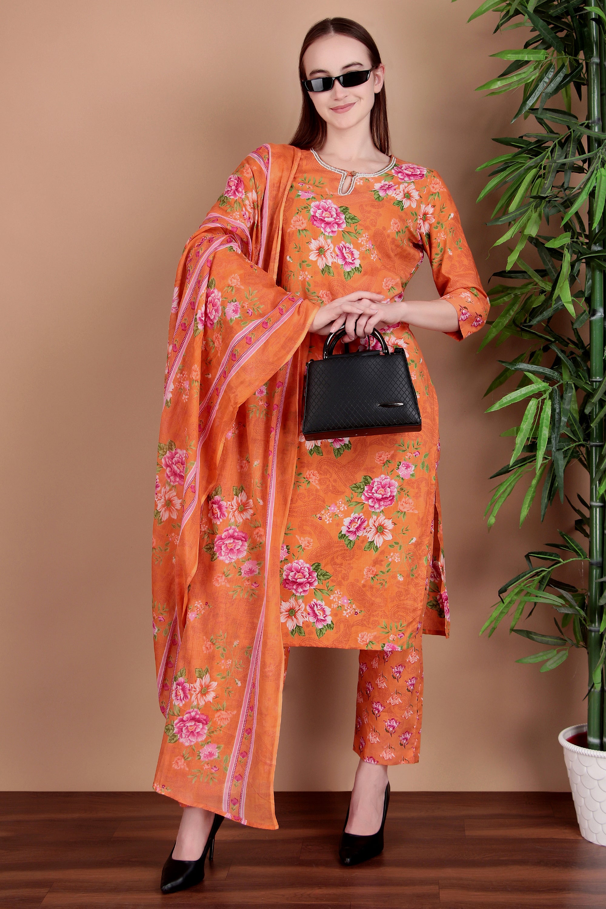 Crafted from soft, breathable cotton fabric, the kurta showcases beautiful printed patterns enhanced with subtle hand work (Adda work) detailing for a refined and graceful look. Designed with a classic round neckline and three-quarter sleeves, the straight silhouette offers a comfortable yet polished fit. Paired with matching pants and a coordinated dupatta, this set is ideal for everyday wear, office dressing, and casual festive occasions.