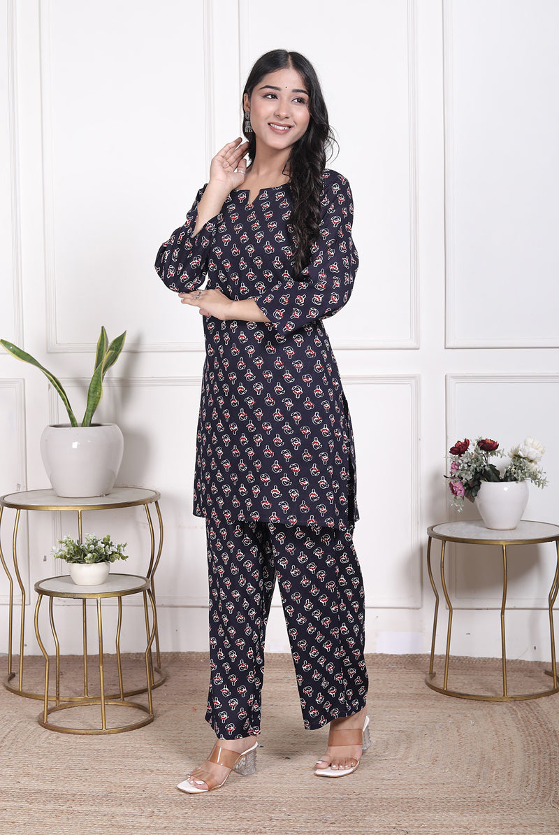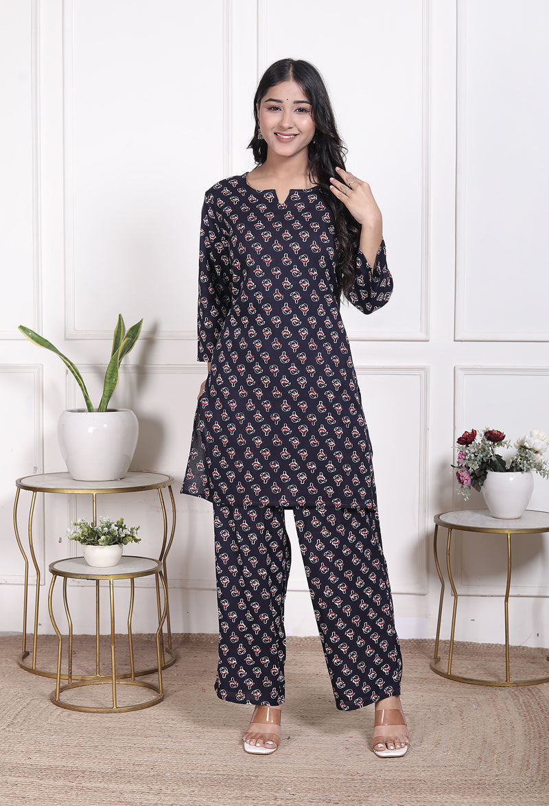 Stay effortlessly stylish with the Miramaar Women's Navy Blue Printed Rayon Coord Set. Designed in soft, flowy rayon, this coord set offers a smooth drape and breathable comfort perfect for all-day wear. The printed top features a straight silhouette with a classic round neck and 3/4 sleeves, paired with matching trousers for a chic and coordinated look. Ideal for casual outings, daily wear, travel, or semi-formal settings, this set blends comfort with modern elegance.