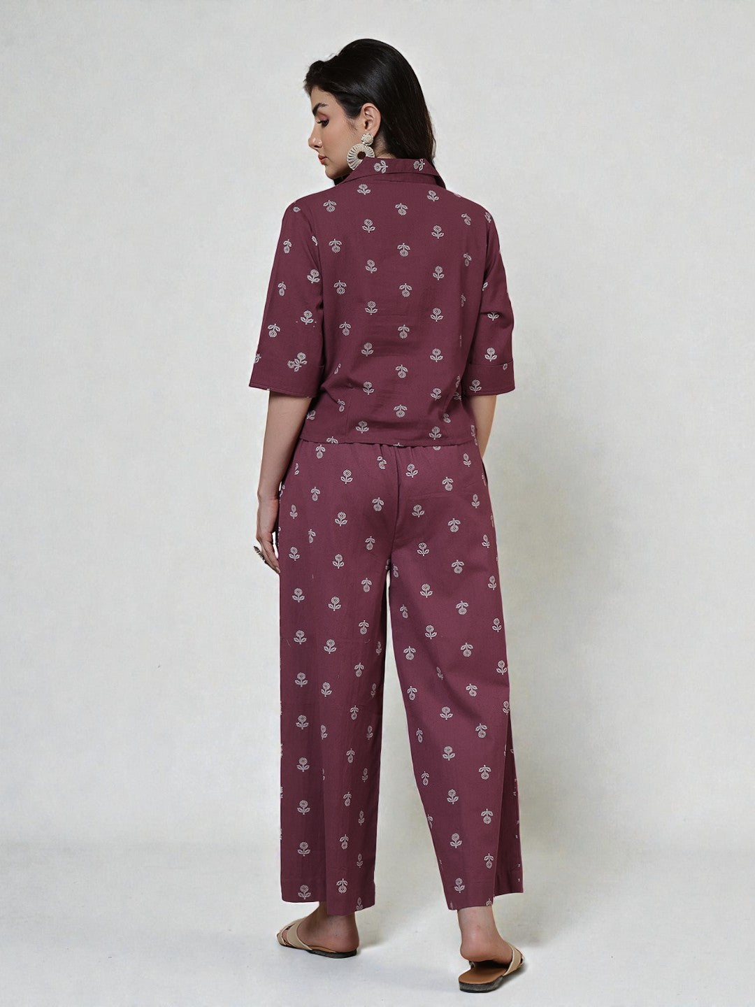 Step up your fusion fashion game with this chic wine cotton-flex co-ord set from Miramaar. Designed with a smart spread-collar crop top and paired with comfortable matching bottoms, this set offers a perfect blend of modern style and effortless elegance. The cotton-flex fabric ensures breathability and ease, while the printed detailing adds a trendy touch. Ideal for brunch outings, casual meet-ups, travel, or festive evenings with a contemporary vibe, this co-ord set is a must-have for your stylish wardrobe.