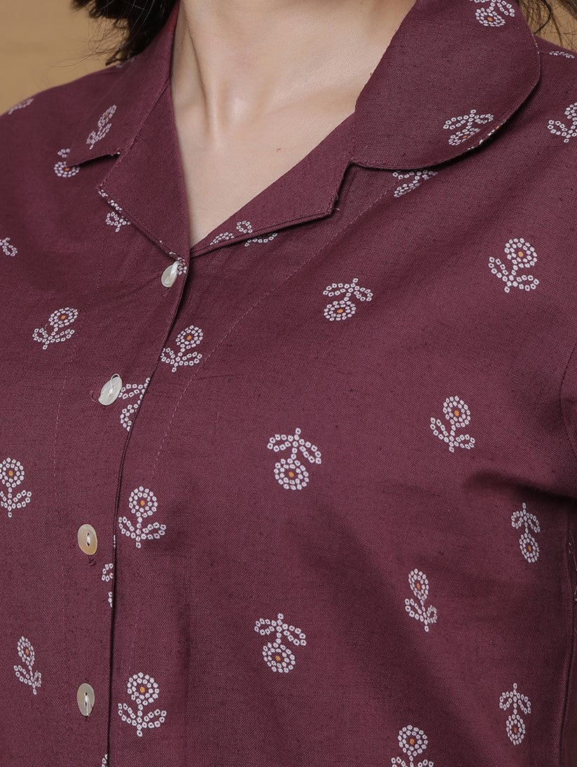 Miramaar Women's Wine Cotton Flex Spread Collar Crop top Coord Set