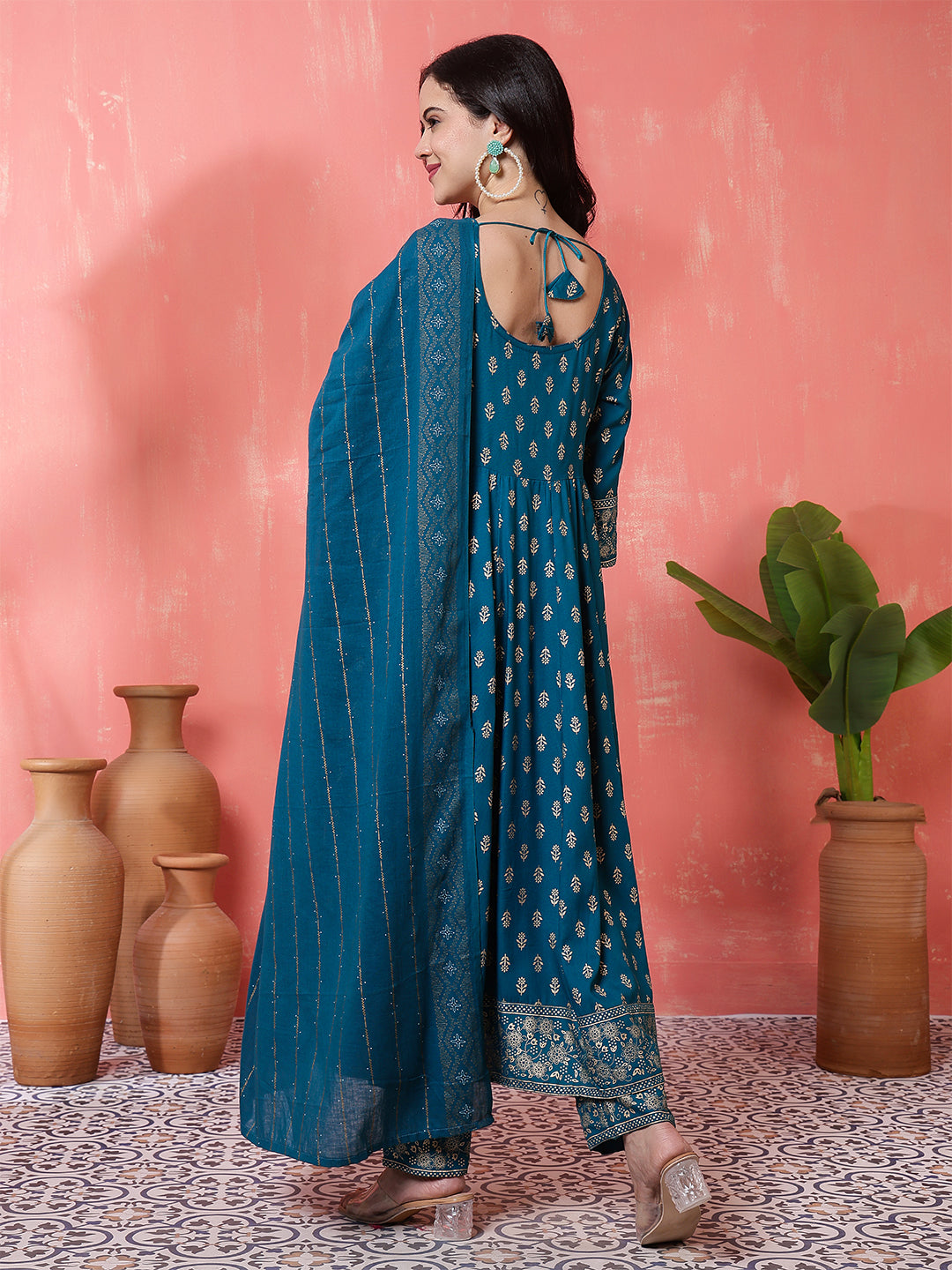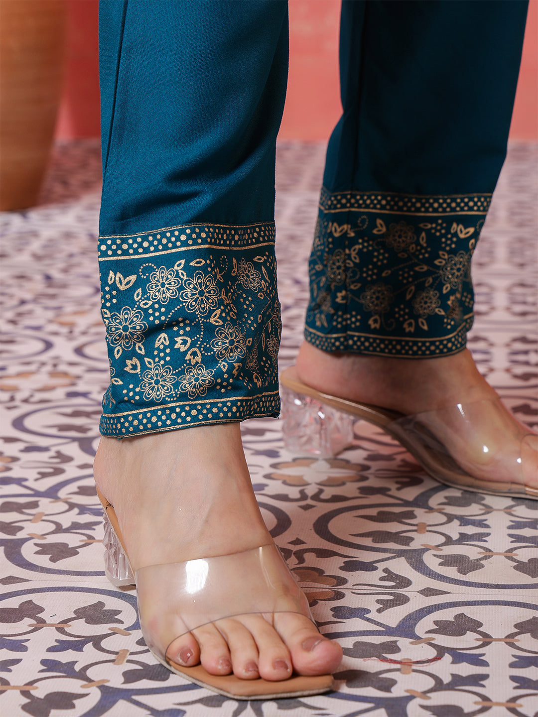 Miramaar Women's Teal Round Neck Embroidered Anarkali Kurti