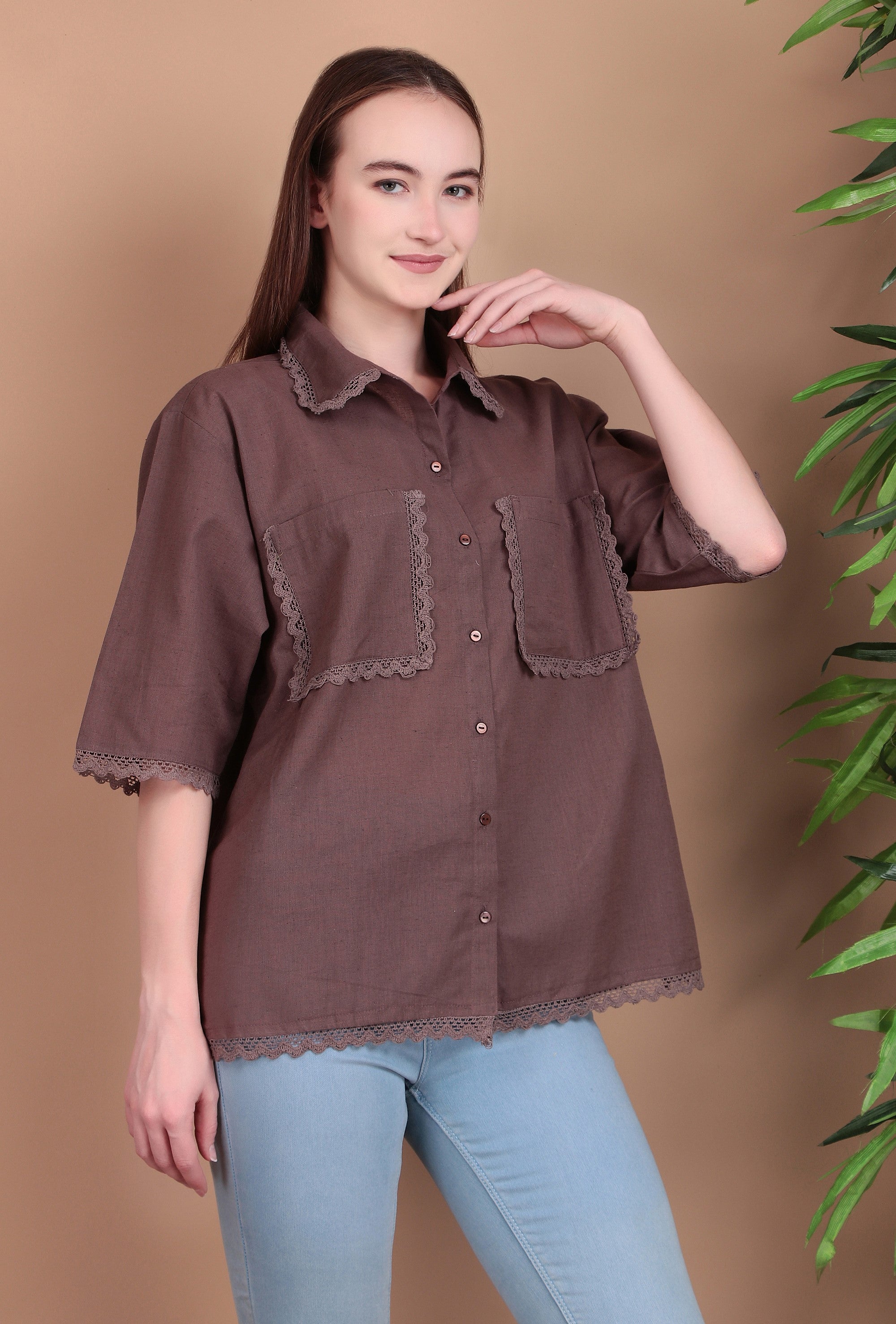 Elevate your everyday style with the Miramaar Women’s Cotton Flex Spread Collar Brown Lace Work Top. Crafted from soft and breathable cotton flex fabric, this top ensures superior comfort and a flattering silhouette throughout the day. The elegant spread collar adds a refined, contemporary touch, while the delicate lace work detailing brings a graceful feminine appeal. Designed with half sleeves and a regular fit, it is a versatile choice for office wear, casual outings, or brunch dates. Pair it effortlessly with jeans or tailored trousers for a polished look.