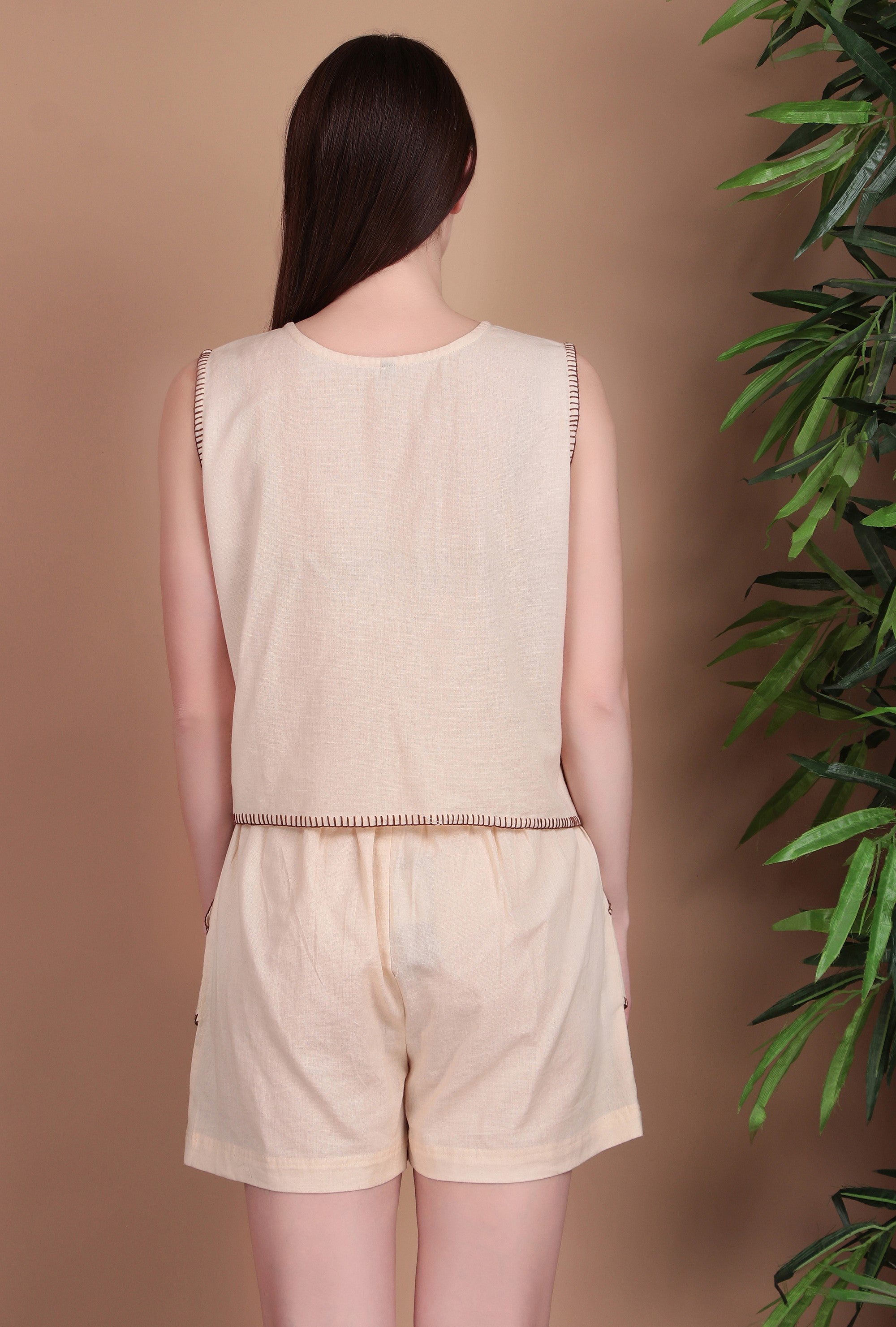 Step into effortless elegance with the Miramaar Women’s Off White Cotton Flex Top & Shorts Co-ord Set. Designed for comfort and style, this chic set features a beautifully embroidered sleeveless top paired with matching shorts. Crafted from soft, breathable, and lightweight cotton flex fabric, it ensures all-day ease while keeping your look fresh and refined. The classic round neckline adds a subtle touch of sophistication, making this co-ord set perfect for casual outings, brunch dates, vacations, or relaxed day wear.