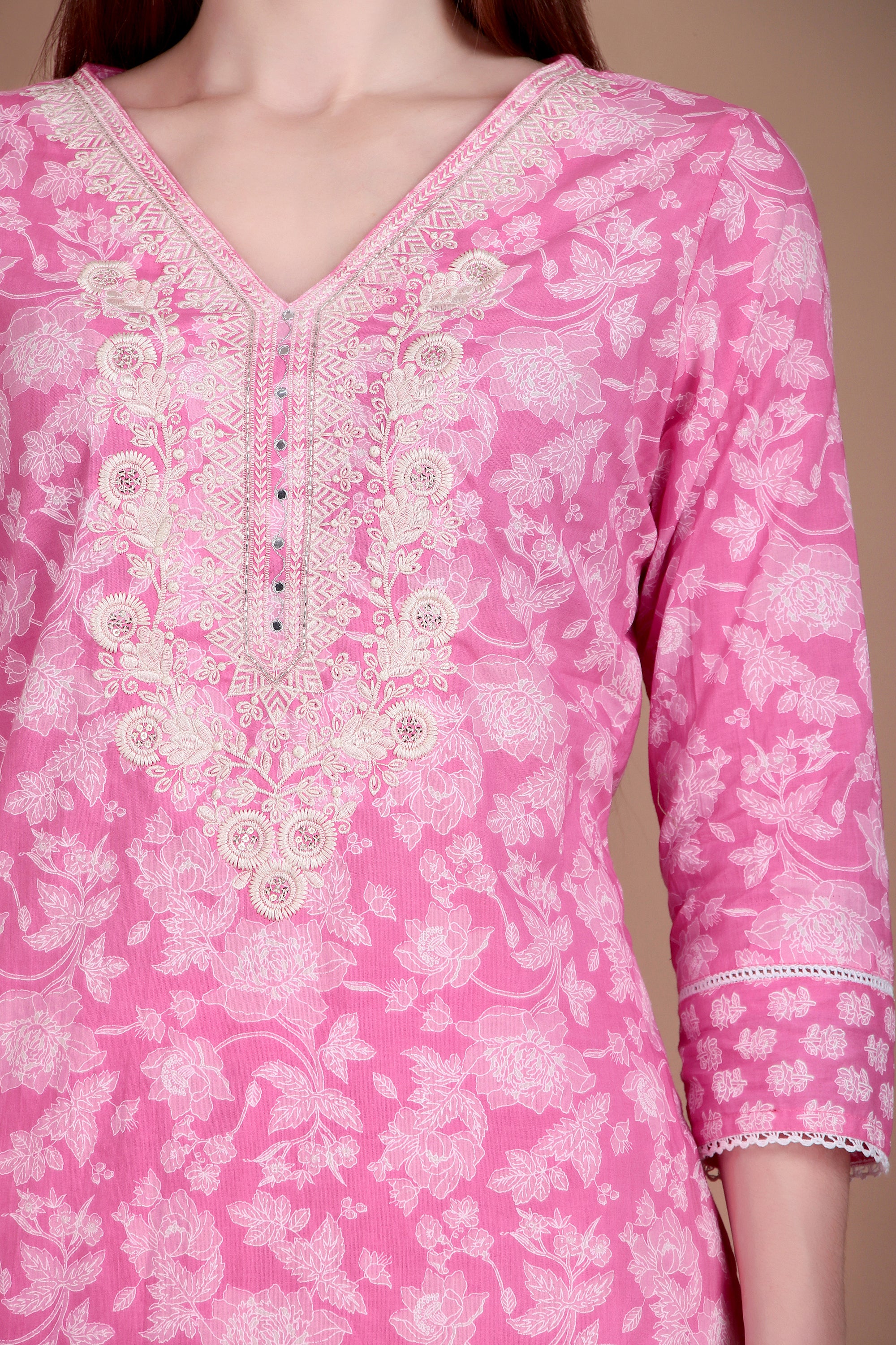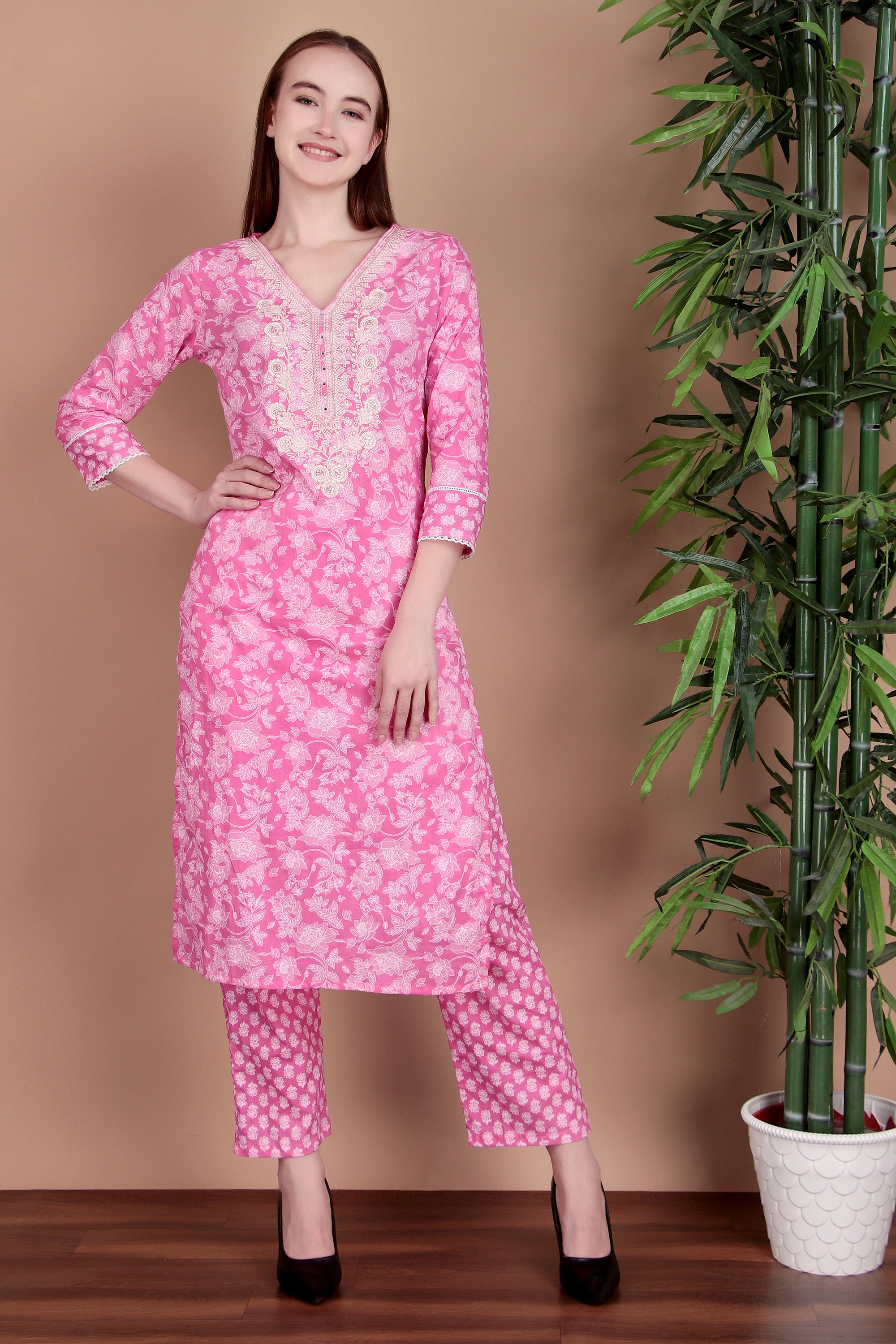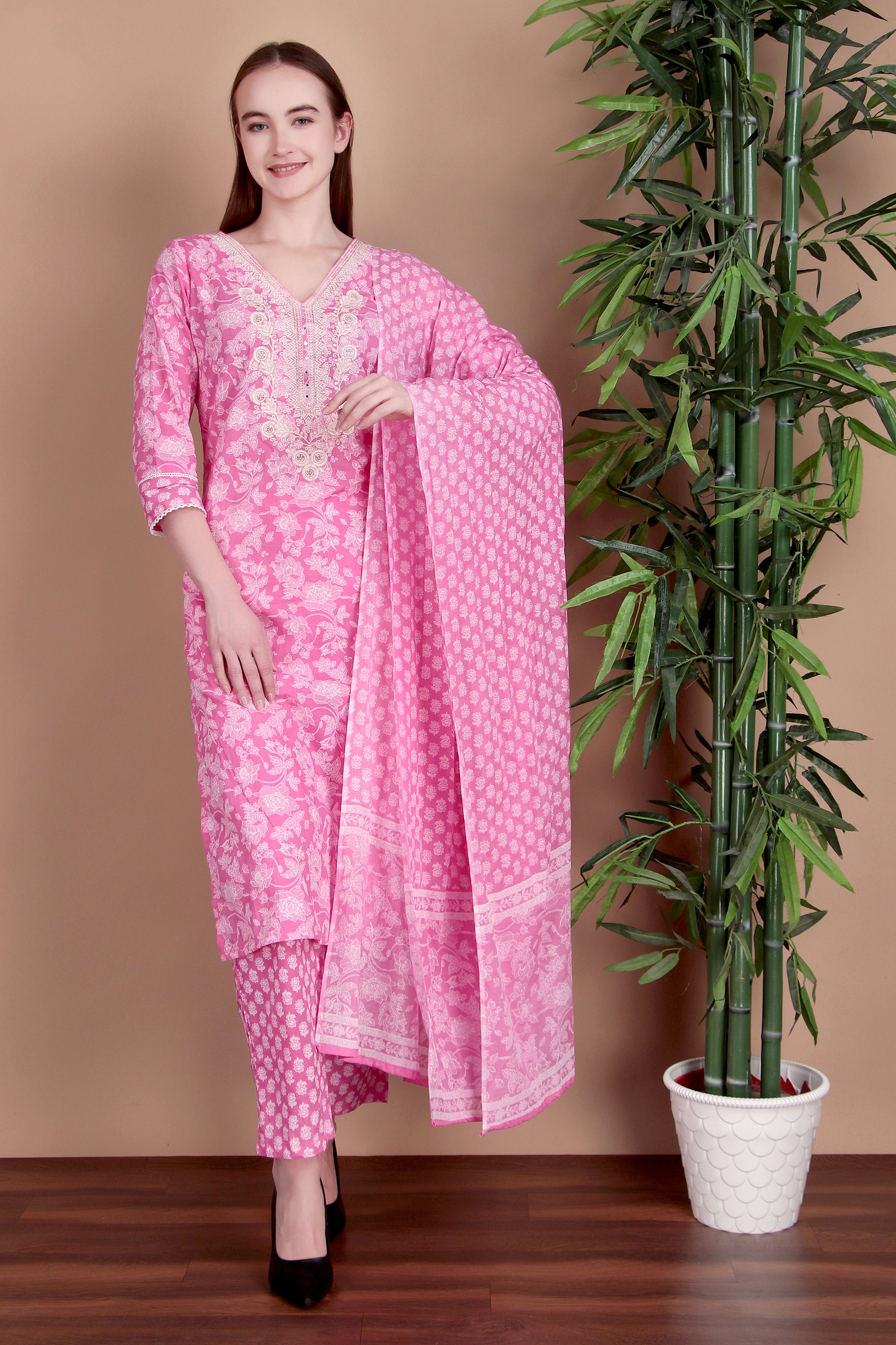 Crafted from breathable cotton fabric, the kurta features beautiful embroidery that adds a refined and graceful touch. The flattering V-neckline and three-quarter sleeves enhance its modern appeal, while the straight silhouette ensures all-day comfort. Paired with matching pants and a coordinated dupatta, this set is perfect for office wear, casual outings, and light festive occasions.