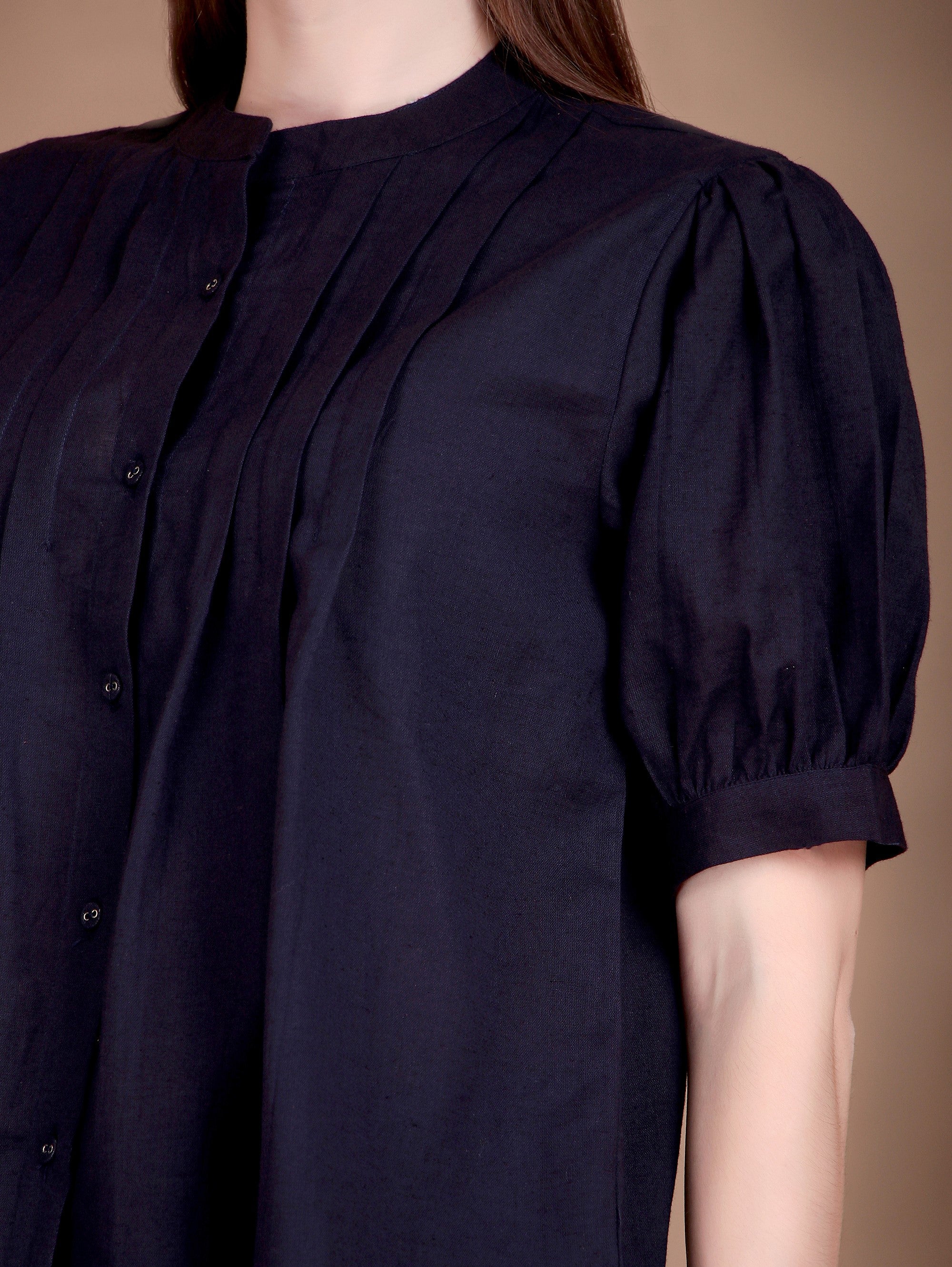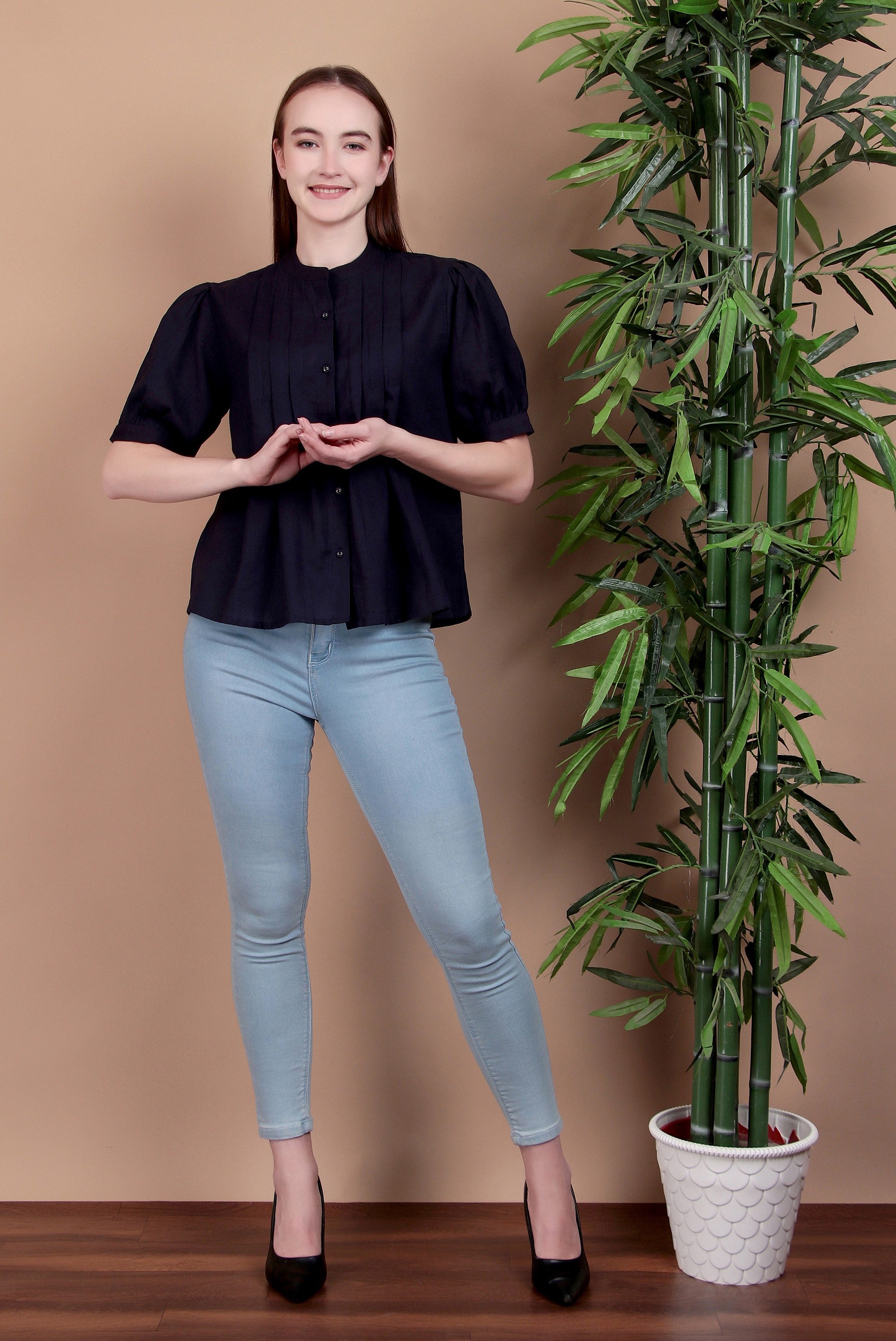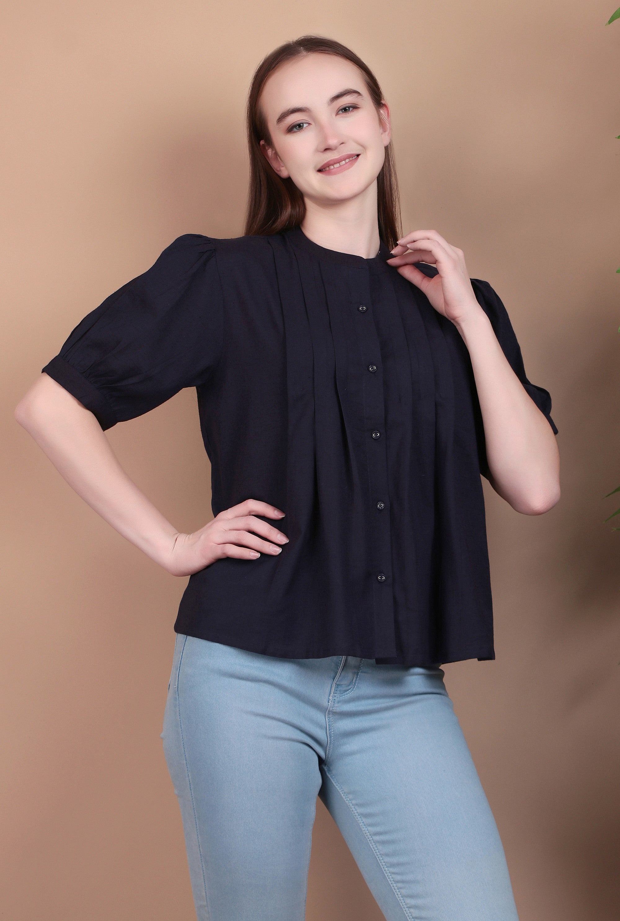Enhance your everyday wardrobe with Miramaar Women's Cotton Flex Solid Blue Pintex Top. Crafted from soft and flexible cotton flex fabric, this top ensures breathable comfort and easy movement throughout the day. The elegant pintex detailing on the front adds subtle texture and sophistication, while the mandarin collar and half sleeves lend a clean, contemporary finish. Ideal for office wear, casual outings, or relaxed day plans, this versatile top offers effortless style with lasting comfort.