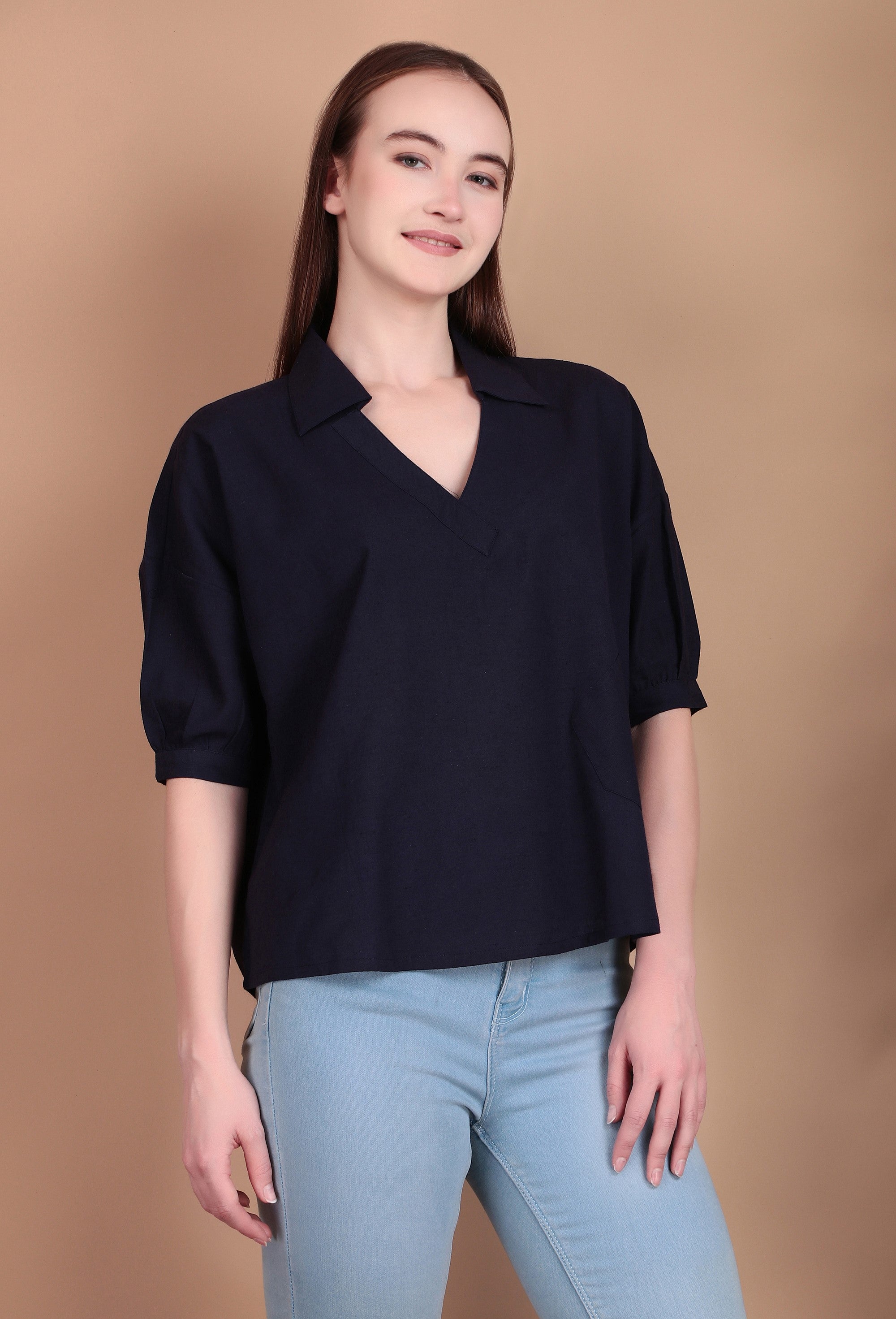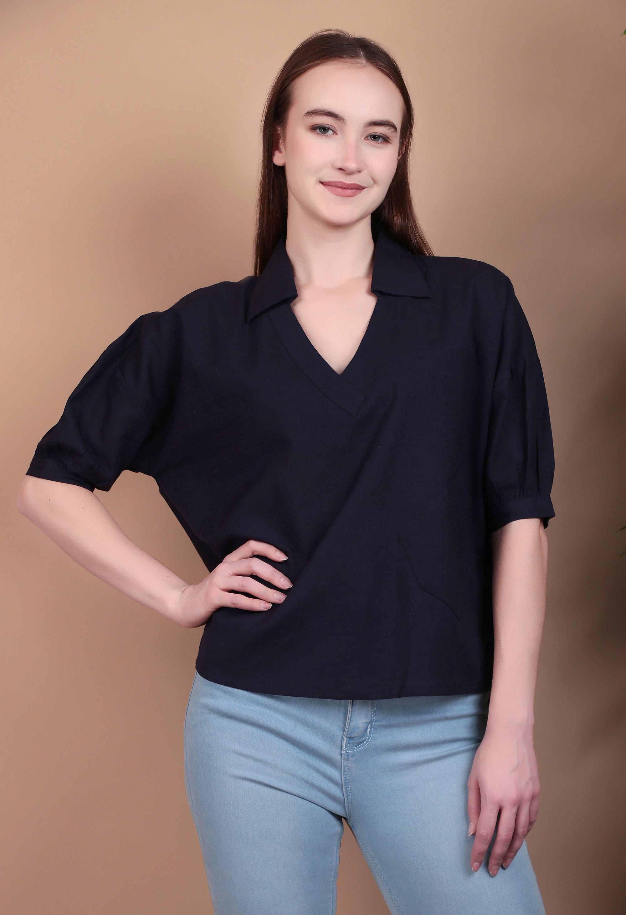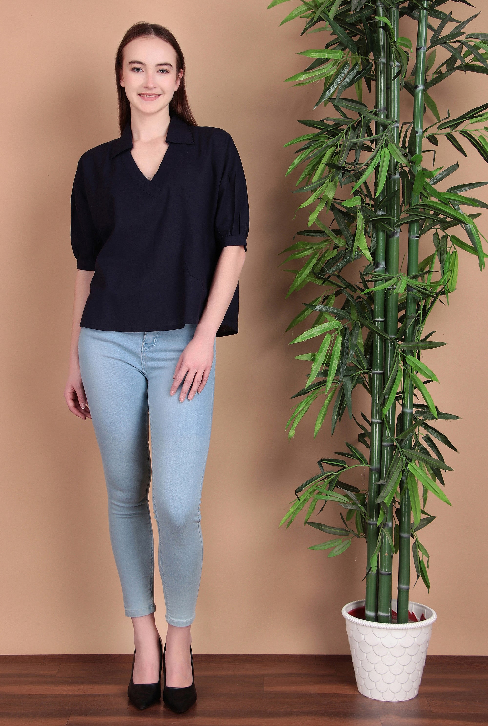 Keep your everyday style effortlessly chic with Miramaar Women's Cotton Flex Solid Blue Regular Top. Crafted from premium cotton flex fabric, this top offers a perfect balance of comfort and flexibility for all-day wear. The solid blue shade lends a clean, elegant look, while the collared lapel neckline and half sleeves add a smart, polished touch. Ideal for casual outings, office wear, or daily styling, this versatile top is a must-have wardrobe essential.