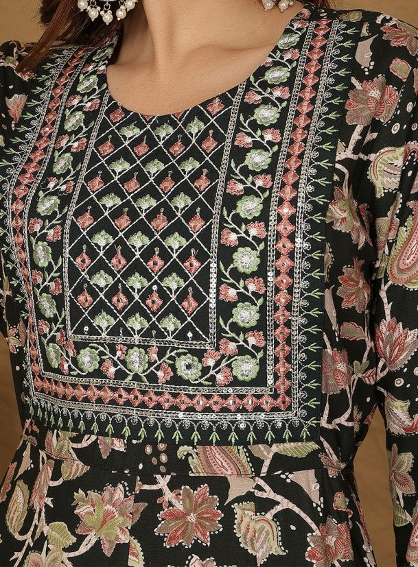 Embrace timeless elegance with this black rayon A-line kurta set from Miramaar. Crafted from soft and breathable rayon, the kurta features intricate embroidery that adds a sophisticated touch to your ethnic wardrobe. The A-line silhouette with a hip-length cut and 3/4 sleeves creates a graceful and flattering shape, suitable for a variety of occasions. Paired with matching bottoms, this set is perfect for festive gatherings, casual outings, or elegant everyday wear.
