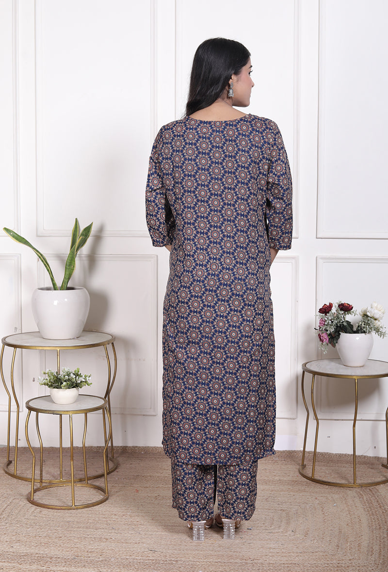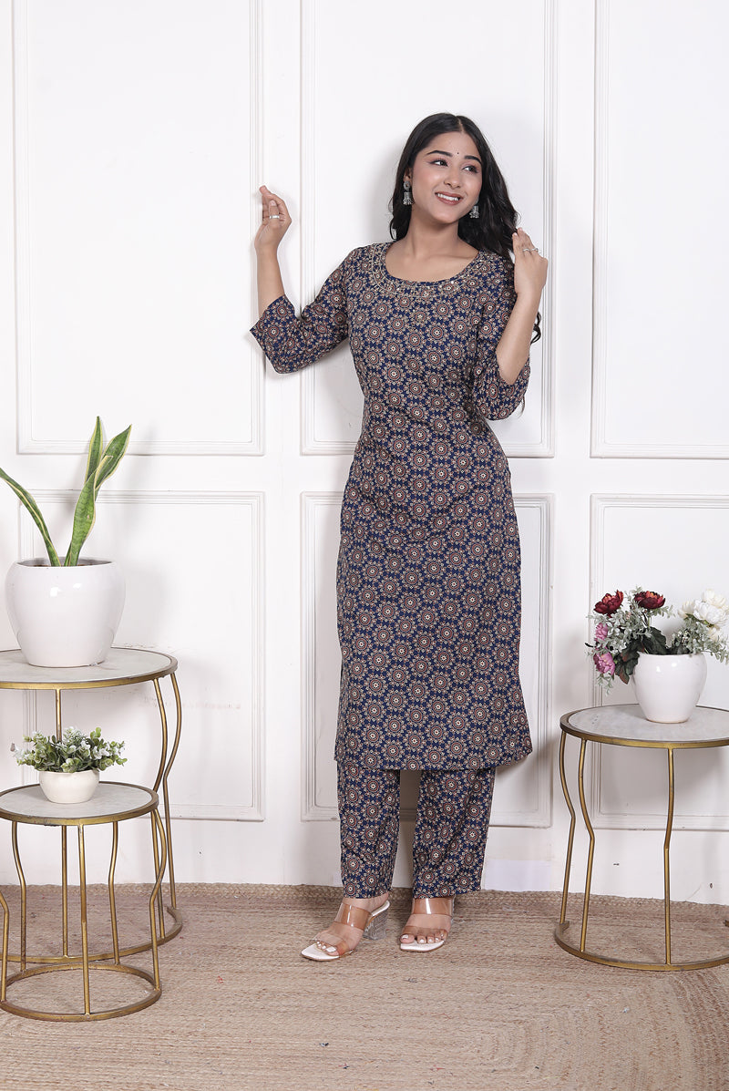 Elevate your everyday ethnic style with the Miramaar Women's Black & Red Straight Printed Adda Work Kurta Set. Crafted from soft poly cotton, this stylish set features a straight-fit kurta adorned with intricate adda work and subtle prints, paired with comfortable matching trousers. The calf-length design, 3/4 sleeves, and classic round neck make it perfect for daily wear, office dressing, or casual outings. Effortless, elegant, and comfortable—this kurta set adds a refined touch to your wardrobe.