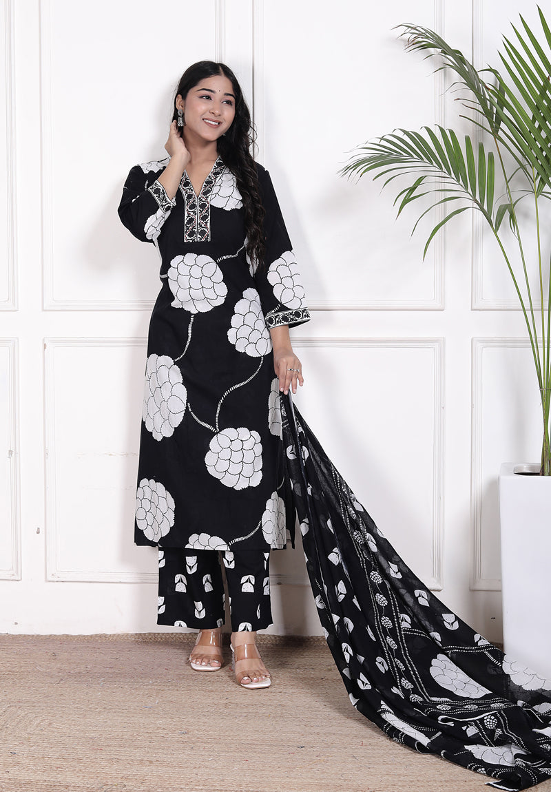 Miramaar Women's Black Straight Printed Kurta Pant Dupatta Set