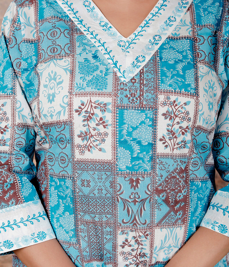 Step into effortless elegance with this Blue Cotton Straight Kurta Pant Set with Dupatta from Miramaar. Crafted from breathable cotton and adorned with refined adda work, it delivers a perfect balance of comfort and ethnic sophistication. The calf-length silhouette and 3/4 sleeves offer a clean and graceful fit, while the coordinated trousers and dupatta complete the look for both everyday wear and special outings.